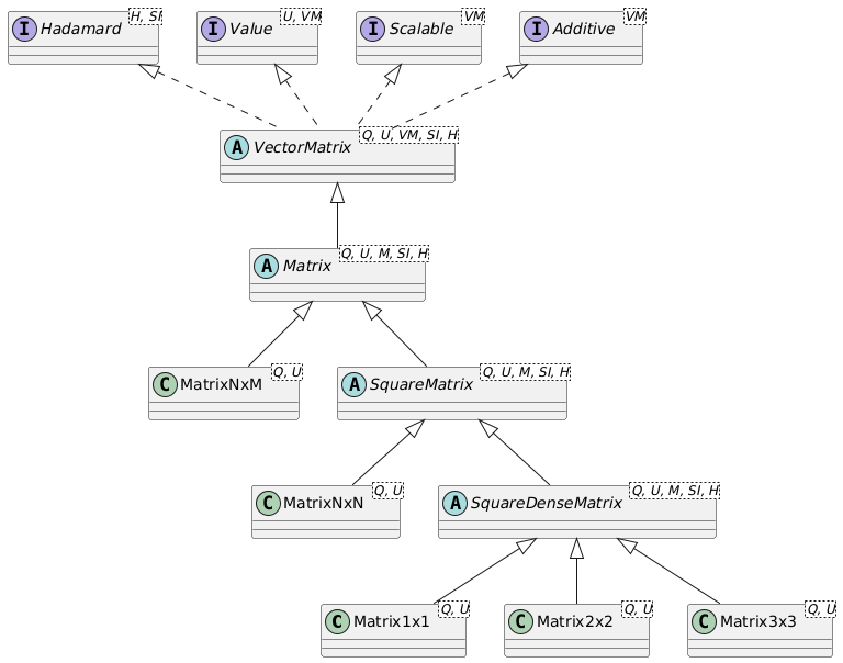 The generic type of SquareMatrix of any size is MatrixNxN. This matrix can also use sparse or dense storage, and store float values or double values. For efficiency reasons, since the MatrixNxN carries quite some overhead for the flexible data storage, separate classes are defined for Matrix1x1, Matrix2x2, and Matrix3x3. Data inside these matrices is stored in a dense double[] array that uses row-major indexing.