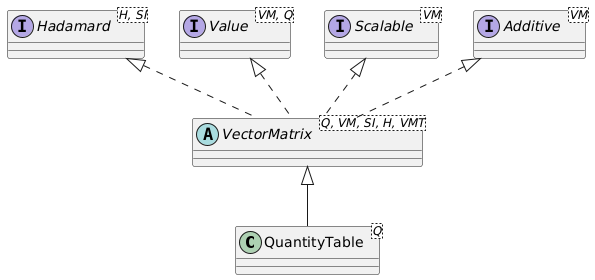 Furthermore, a quantity table is additive, which means that two tables of the same size and same quantity can be added to and subtracted from each other. Quantity tables also implement the Scalable interface, which exposes the scaleBy(double factor) and divideBy(double factor) methods, scaling the entries of the quantity table by factor, respectively 1.0 / factor.